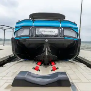 The Sea-Doo Switch has a distinctive tri-hull pontoon design that differs from traditional PWCs or runabouts. Its modular deck and hybrid construction require a docking system that can match its shape and weight distribution without overcomplicating the docking process. The Wave Armor Switch Port meets that challenge head-on, offering a roller-based drive-on system that allows the craft to roll smoothly into place without dragging or scraping the hull.